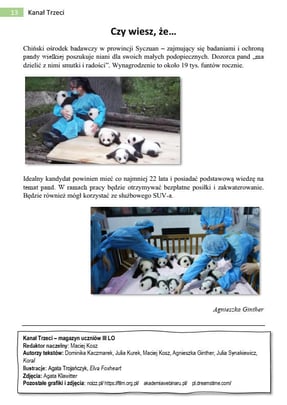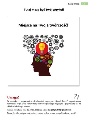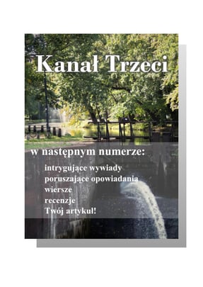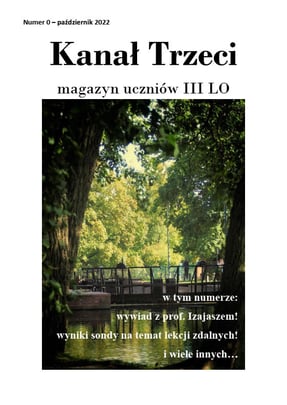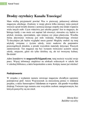 Drodzy czytelnicy Kanału Trzeciego! Mam wielką przyjemność powitać Was w pierwszej, pokazowej odsłonie magazynu Kanał Trzeci. Zrodzony w mojej głowie kilka miesięcy temu pomysł wreszcie ujrzał światło dzienne z pomocą naszego zespołu oraz dzięki wsparciu wielu innych osób. Czym właściwie jest ta gazeta? Jest to magazyn, do którego każdy z nas może coś napisać lub stworzyć, nieważne czy będzie to artykuł, recenzja, opowiadanie, opis miejsca czy praca plastyczna. Wszelka forma aktywności twórczej jest mile widziana. Podsumowując również Ty decydujesz jak będzie wyglądać nasza gazeta! Mogłyby znaleźć się tutaj artykuły związane z życiem szkoły, treści naukowe dla pasjonatów poszczególnych dziedzin, a przede wszystkim materiały dotyczące Waszych zainteresowań. Ten magazyn ma być wyrazem twórczości uczniów naszej szkoły, miejscem, gdzie nie tylko dzielimy się, ale też tworzymy kulturę. Do dzieła!