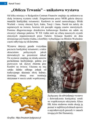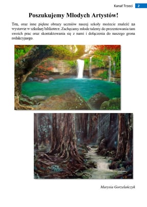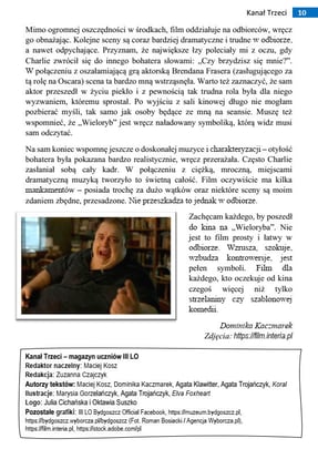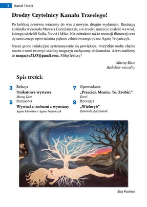 Drodzy Czytelnicy Kanału Trzeciego! Po krótkiej przerwie wracamy do was z nowym, drugim wydaniem. Ilustrację z okładki wykonała Marysia Gorzelańczyk, a w środku możecie znaleźć wywiad, którego udzielili Sofia, Yuvvi i Mike. Nie zabraknie także recenzji filmowej oraz dynamicznego opowiadania pięknie zilustrowanego przez Agatę Trojańczyk. Nasze grono redakcyjne systematycznie się powiększa, wszystkie osoby chętne razem z nami tworzyć magazyn zachęcam do kontaktu. Miłej lektury!
